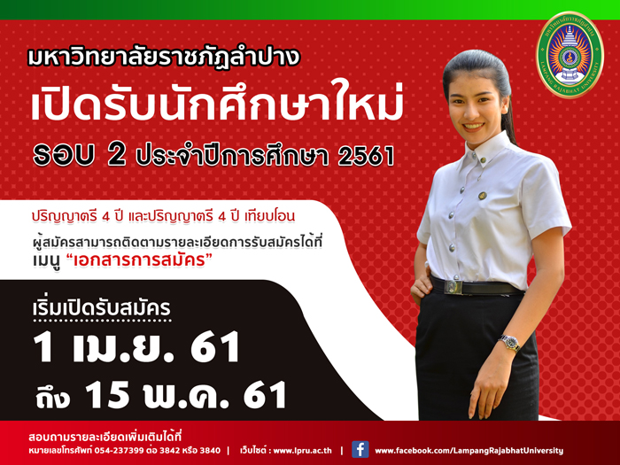 มหาวิทยาลัยราชภัฏลำปาง เปิดรับนักศึกษาใหม่ รอบ 2 ประจำปีการศึกษา 2561