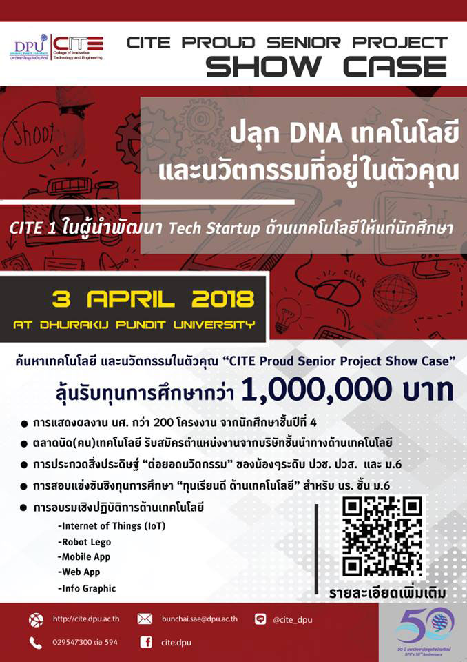 นอกจากนี้ยังมีการแสดงผลงานของนักศึกษากว่า 200 โครงงานจากฝีมือนักศึกษาชั้นปีที่ 4 และกิจกรรมอบรมเชิงปฏิบัติการ Mobile App with App Inventor, Internet of Things :IoT , Lego Robot , Web App โดยกิจกรรมจะจัดขึ้นในวันอังคารที่ 3 เมษายน 2561 ที่ มหาวิทยาลัยธุรกิจบัณฑิตย์ สอบถามเพิ่มเติมโทร 0-2954-7300 ต่อ 594, 084-624-4983 หรือ Line@ : @cite_dpu