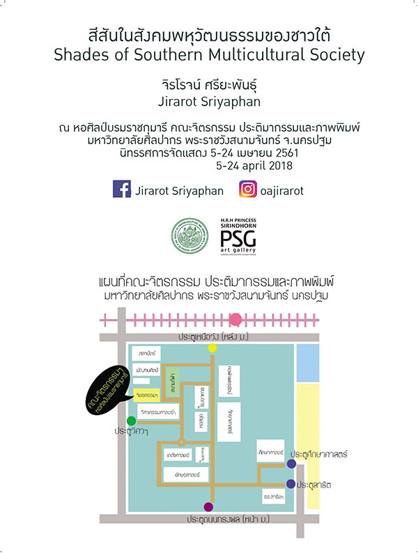 ขอเชิญชมนิทรรศการ "สีสันในสังคมพหุวัฒนธรรมของชาวใต้" โดย จิรโรจน์ ศรียะพันธุ์ วันที่ 5 - 24 เมษายน 2561 เปิดให้เข้าชม วันจันทร์ - เสาร์ เวลา 09.00 - 16.30 น. *ชมฟรี* ปิดวันอาทิตย์และวันหยุดนักขัตฤกษ์ ณ หอศิลป์บรมราชกุมารี คณะจิตรกรรม ประติมากรรมและภาพพิมพ์ มหาวิทยาลัยศิลปากร พระราชวังสนามจันทร์ จังหวัดนครปฐม สอบถามข้อมูลเพิ่มเติม Facebook Page : Psg Art Gallery หรือ www.facebook.com/psgartgallerysilpakorn/