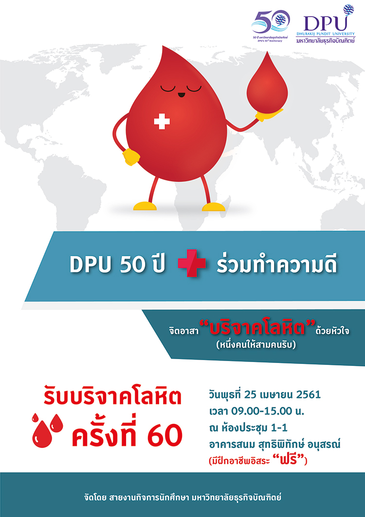 ศูนย์บริการโลหิตแห่งชาติ สภากาชาดไทย ร่วมกับ สำนักกิจการนักศึกษา มหาวิทยาลัยธุรกิจบัณฑิตย์ ชวนทุกท่านร่วมบริจาคโลหิต ครั้งที่ 60 “DPU 50 ปี ร่วมทำความดี” จิตอาสาบริจาคโลหิตด้วยหัวใจ (1 คนให้ 3 คนรับ) นอกจากนี้ยังมีการบริจาคดวงตา บริจาคอวัยวะ บริจาคเกล็ดเลือด และสเต็มเซลล์ และตรวจวัดสายตาประกอบแว่น พร้อมฝึกอาชีพอิสระฟรี ในวันพุธที่ 25 เมษายน 2561 เวลา 09.00-15.00 น. ณ ห้องประชุมสนม สุทธิพิทักษ์ อนุสรณ์ (1-1) อาคาร อาคารสนม สุทธิพิทักษ์ อนุสรณ์ มหาวิทยาลัยธุรกิจบัณฑิตย์