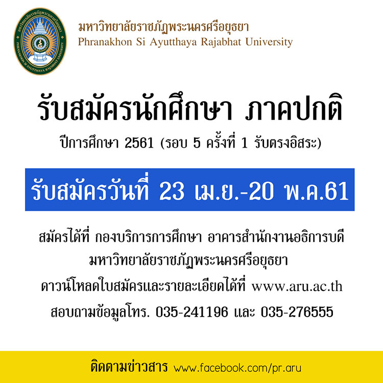 มหาวิทยาลัยราชภัฏพระนครศรีอยุธยา รับสมัครนักศึกษา ภาคปกติ ปีการศึกษา 2561 (รอบ 5 ครั้งที่ 1 รับตรงอิสระ)