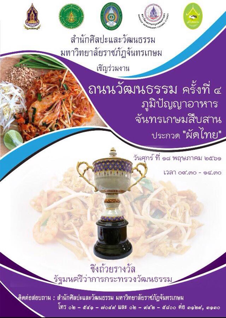 มหาวิทยาลัยราชภัฏจันทรเกษม (มจษ.) จัดงานถนนวัฒนธรรม ครั้งที่ 4 เชิญชวนบุคลากร นักศึกษา และประชาชนร่วมอนุรักษ์สืบสานวัฒนธรรมและพบกับการประกวดแข่งขันผัดไทย ชิงถ้วยรัฐมนตรีว่าการกระทรวงวัฒนธรรม พร้อมซุ้มอาหารไทยคาว หวาน ปลูกจิตสำนึก ความรักและหวงแหนในวัฒนธรรมและภูมิปัญญาไทย