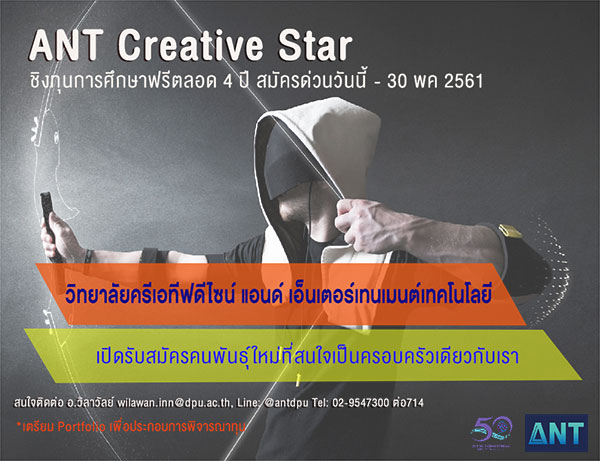 วิทยาลัยครีเอทีฟดีไซน์ แอนด์ เอ็นเตอร์เทนเมนต์เทคโนโลยี (ANT) มหาวิทยาลัยธุรกิจบัณฑิตย์ เปิดรับสมัครน้อง ม.6 ชิงทุนการศึกษาฟรีตลอด 4 ปีเต็ม “ANT Creative Star” สำหรับคนพันธุ์ใหม่ที่สนใจร่วมเป็นครอบครัวเดียวกับเรา เพียงแค่มีเกรดเฉลี่ยตั้งแต่ 2.50 ขึ้นไป มีผลงานการประกวด เช่น โครงงานสิ่งประดิษฐ์ งานศิลปสร้างสรรค์ การถ่ายภาพ คลิปกราฟิกภาพยนตร์ (หนังสั้น, รายการบน YouTube) หรือทักษะความสามารถพิเศษอื่นๆ สมัครพร้อมเตรียม Portfolio เพื่อยื่นพิจารณาทุน เปิดรับสมัครแล้ววันนี้ จนถึงวันที่ 30 พฤษภาคม 2561 สมัครออนไลน์ได้ที่ http://www.dpu.ac.th/onlineadmission/ หรือสอบถามรายละเอียดเพิ่มเติม โทร.02-954-7300 ต่อ 714