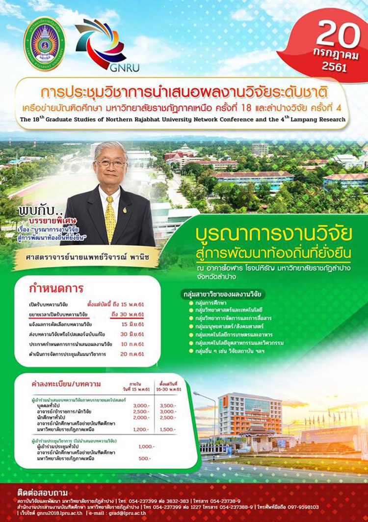 การประชุมวิชาการนำเสนอผลงานวิจัยระดับชาติ เครือข่ายบัณฑิตศึกษา มหาวิทยาลัยราชภัฏภาคเหนือ ครั้งที่ 18 และลำปางวิจัย ครั้งที่ 4