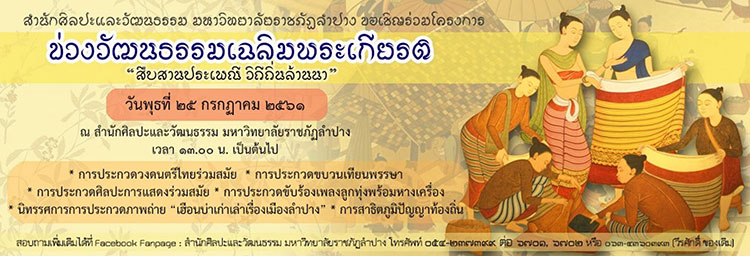 สำนักศิลปะและวัฒนธรรม ม.ราชภัฏลำปาง ขอเชิญร่วมโครงการข่วงวัฒนธรรมเฉลิมพระเกียรติ "สืบสานประเพณี วิถีถิ่นล้านนา"