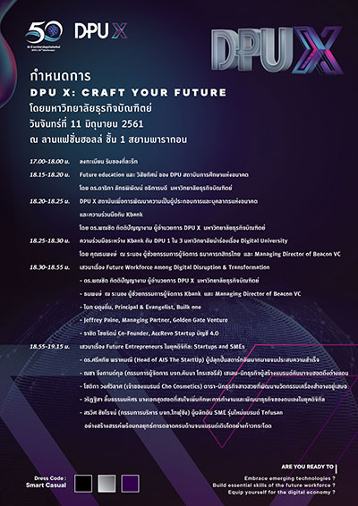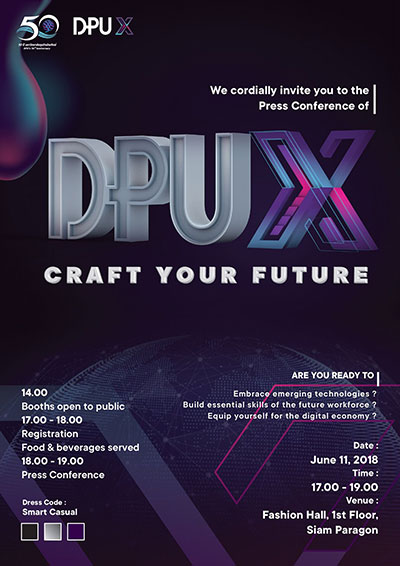 มหาวิทยาลัยธุรกิจบัณฑิตย์ ขอเชิญชวนทุกท่านร่วมงานเปิดตัว DPU X: CRAFT YOUR FUTURE (สถาบันเพื่อการพัฒนาความเป็นผู้ประกอบการและบุคลากรแห่งอนาคต) เพื่อสร้างบุคลากรที่ตอบโจทย์การทำงานในอนาคตโดยมีเทคโนโลยีเข้ามามีบทบาทสำคัญ พัฒนาผู้ประกอบการในยุคดิจิทัลให้สามารถต่อยอดทิศทางการดำเนินธุรกิจให้เติบโตในอนาคต ดังนั้น DPU X จึงมีความหลากหลายในด้านดิจิทัล ไอที และธุรกิจสตาร์ทอัพ รองรับอาชีพหรือธุรกิจเกิดใหม่ในอนาคต