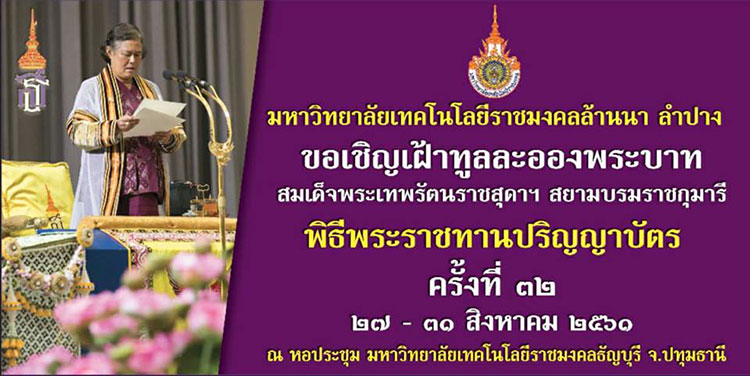 มหาวิทยาลัยเทคโนโลยีราชมงคลล้านนา ได้รับพระมหากรุณาธิคุณจากสมเด็จพระเจ้าอยู่หัวทรงพระกรุณาโปรดเกล้าฯ ให้สมเด็จพระเทพรัตนราชสุดาฯ สยามบรมราชกุมารี เสด็จฯ แทนพระองค์ ในการพระราชทานปริญญาบัตรแก่ผู้สำเร็จการศึกษา ประจำปีการศึกษา ๒๕๖๐ จากมหาวิทยาลัยเทคโนโลยีราชมงคลทั้ง ๘ แห่ง ระหว่างวันที่ ๒๗ – ๓๑ สิงหาคม ๒๕๖๑ ณ หอประชุมมหาวิทยาลัยเทคโนโลยีราชมงคลธัญบุรี จังหวัดปทุมธานี (ภาคเช้าและภาคบ่าย) ปีนี้ มีผู้สำเร็จการศึกษาจากมหาวิทยาลัยเทคโนโลยีราชมงคลล้านนา รวมจำนวนห้าพันคน
