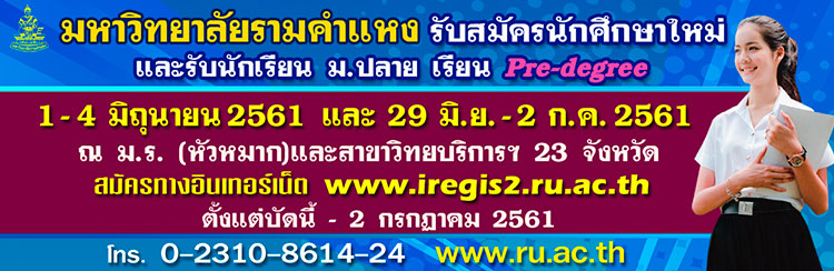 มหาวิทยาลัยรามคำแหง รับสมัครนักศึกษาใหม่ระดับปริญญาตรี ภาค 1 ปีการศึกษา 2561 ทั้งส่วนกลาง (หัวหมาก) และส่วนภูมิภาค (23 จังหวัด) ระหว่างวันที่ 1-4 มิถุนายน และ 29 มิถุนายน - 2 กรกฎาคม 2561 (ทุกวัน) หรือสมัครทางอินเทอร์เน็ตที่ www.iregis2.ru.ac.th ตั้งแต่บัดนี้ - 2 กรกฎาคม 2561 รวมทั้งเปิดรับนักเรียนชั้นมัธยมศึกษาตอนปลายเข้าศึกษาในระบบ Pre-degree เพื่อสะสมหน่วยกิตล่วงหน้า โดยสามารถนำหน่วยกิตมาเทียบโอนได้เมื่อจบ ม.6