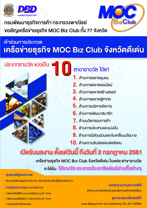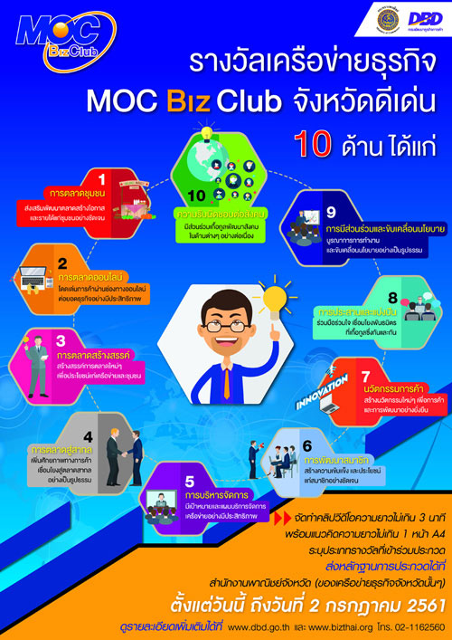 อย่างไรก็ตาม สำหรับ การประกวดเครือข่าย MOC Biz Club ดีเด่น จะแบ่งเป็น 10 สาขารางวัล ได้แก่ 1. ด้านการตลาดชุมชน : ส่งเสริมพัฒนาตลาด สร้างโอกาสและรายได้แก่ชุมชนอย่างชัดเจน 2.ด้านการตลาดออนไลน์ :โดดเด่นการค้าผ่านช่องทางออนไลน์ ต่อยอดธุรกิจอย่างมีประสิทธิภาพ 3.ด้านการตลาดสร้างสรรค์ : สร้างสรรค์การตลาดใหม่ๆ เพื่อประโยชน์แก่เครือข่ายและชุมชน 4. ด้านการตลาดสู่สากล : เพิ่มศักยภาพทางการค้า เชื่อมโยงสู่ตลาดสากลอย่างเป็นรูปธรรม 5. ด้านการบริหารจัดการ : มีเป้าหมายและแผนบริการจัดการเครือข่ายอย่างมีประสิทธิภาพ 6. ด้านการพัฒนาสมาชิก : สร้างความเข้มแข็ง และประโยชน์แก่สมาชิกอย่างชัดเจน 7. ด้านนวัตกรรมการค้า : สร้างนวัตกรรมใหม่ๆ เพื่อการค้าและการพัฒนาอย่างยั่งยืน 8. ด้านการประสานและแบ่งปัน :ร่วมมือร่วมใจ เชื่อมโยงพันธมิตรที่เกื้อกูลซึ่งกันและกัน 9.ด้านการมีส่วนร่วมและขับเคลื่อนนโยบาย:บูรณาการการทำงานและขับเคลื่อนนโยบายอย่างเป็นรูปธรรม และ 10. ด้านความรับผิดชอบต่อสังคม : มีส่วนร่วมเกื้อกูลพัฒนาสังคม ในด้านต่างๆ อย่างต่อเนื่อง