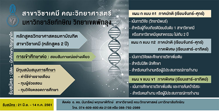 มหาวิทยาลัยทักษิณ วิทยาเขตพัทลุง สาขาวิชาเคมี คณะวิทยาศาสตร์ รับสมัคร : นิสิต - นักศึกษาปริญญาโท หลักสูตรวิทยาศาสตรมหาบัณฑิต สาขาวิชาเคมี (หลักสูตร 2 ปี)