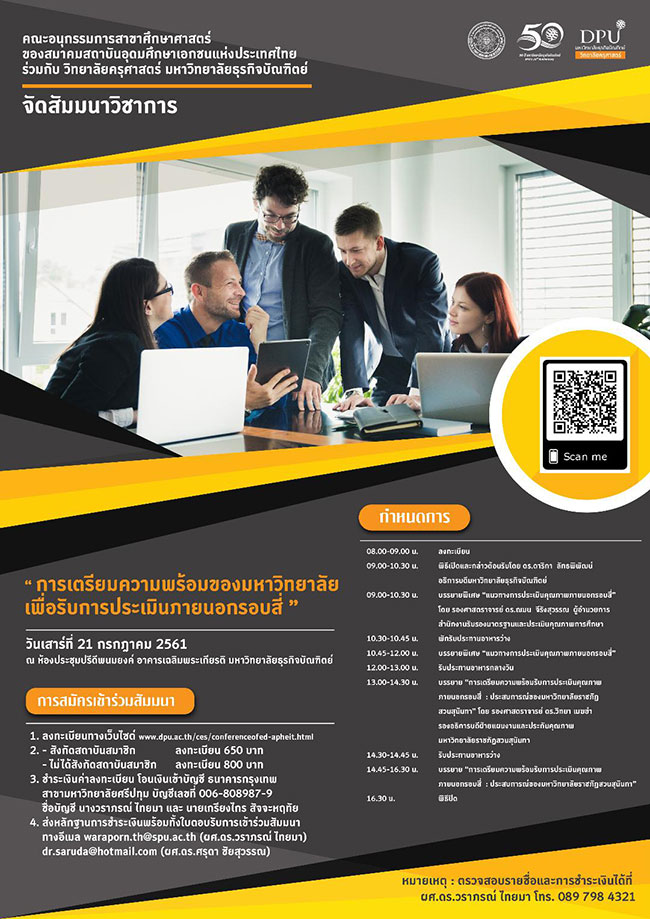 วิทยาลัยครุศาสตร์ มหาวิทยาลัยธุรกิจบัณฑิตย์สมาคมร่วมกับ คณะอนุกรรมการสาขาศึกษาศาสตร์ สถาบันอุดมศึกษาเอกชนแห่งประเทศไทย (สสอท.) ขอเชิญชวนผู้สนใจเข้าร่วม สัมมนาวิชาการ “การเตรียมความพร้อมของมหาวิทยาลัยเพื่อรับการประเมินคุณภาพภายนอกรอบสี่” พร้อมรับฟังการบรรยายพิเศษ หัวข้อ “แนวทางการประเมินคุณภาพนอกรอบสี่” โดย รศ.ดร.ณมน จีรังสุวรรณ ผู้อำนวยการสำนักงานรับรองมาตรฐานและประเมินคุณภาพการศึกษา (องค์การมหาชน) และบรรยายเพื่อเตรียมความพร้อม หัวข้อ “ประสบการณ์ของมหาวิทยาลัยราชภัฏสวนสุนันทา” โดย รศ.ดร.วิทยา เมฆขำ รองอธิการบดีฝ่ายแผนงานและประกันคุณภาพ มหาวิทยาลัยราชภัฏสวนสุนันทา โครงการดังกล่าวจัดขึ้นเพื่อให้ผู้ปฏิบัติของมหาวิทยาลัยได้ทราบแนวทาง รวมถึงรายละเอียดในการดำเนินการและการเตรียมความพร้อมของมหาวิทยาลัยในการรับการประเมินรอบสี่ ทั้งยังได้แลกเปลี่ยนความรู้ ขยายเครือข่ายความร่วมมือระหว่างคณาจารย์ นักวิชาการ และ ผู้สนใจทั่วไปเพื่อเตรียมความพร้อมของมหาวิทยาลัยได้อย่างมีประสิทธิภาพ ซึ่งจะจัดขึ้นใน วันเสาร์ที่ 21 กรกฎาคม 2561ตั้งแต่เวลา 08.00- 16.30 น. ณ ห้องประชุมปรีดี พนมยงค์ มหาวิทยาลัยธุรกิจบัณฑิตย์