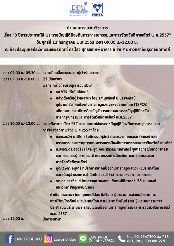 คณะนิติศาสตร์ปรีดี พนมยงค์ มหาวิทยาลัยธุรกิจบัณฑิตย์ ขอเชิญชวนผู้สนใจร่วมฟังเสวนา ในหัวข้อ “3 ปี การประกาศใช้พระราชบัญญัติป้องกันการทารุณกรรมและจัดสวัสดิภาพสัตว์ พ.ศ.2557” โดยมีผู้ร่วมเสวนา อาทิ นสพ.สรวิศ ธานีโต อธิบดีกรมปศุสัตว์ กระทรวงเกษตรและสหกรณ์ ศ.สพญ.ดร.อัจฉรียา ไศละสูด คณะสัตวแพทยศาสตร์ จุฬาลงกรณ์มหาวิทยาลัย คุณเจษฎา อนุจารี ที่ปรึกษาสมาคมป้องกันการทารุณสัตว์แห่งประเทศไทย และ ผศ.ดร.กรรภิรมย์ โกมลารชุน รองคณบดีคณะนิติศาสตร์ปรีดี พนมยงค์ มหาวิทยาลัยธุรกิจบัณฑิตย์ ดำเนินการเสวนาโดย คุณพรอัปสร นิลจินดา ผู้อำนวยการส่วนผลิตรายการสถานีวิทยุโทรทัศน์แห่งประเทศไทย กรมประชาสัมพันธ์ (NBT) การเสวนาดังกล่าวขึ้นในวันศุกร์ที่ 13 กรกฎาคม 2561 ตั้งแต่เวลา 09.00 – 12.00 น. ณ ห้องประชุม ดร.ไสว สุทธิพิทักษ์ อาคาร 6 ชั้น 7 มหาวิทยาลัยธุรกิจบัณฑิตย์