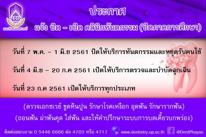 *** สามารถเดินทางเข้ารับบริการได้ฟรี ตามวันและเวลาดังกล่าว ณ ศูนย์บริการทางทันตกรรม อาคารปฏิบัติการทันตกรรม มหาวิทยาลัยพะเยา ติดต่อสอบถามข้อมูลเพิ่มเติมได้ที่โทร 0 5446 6666 ต่อ 4703, 4717 หรือ www.dentistry.up.ac.th