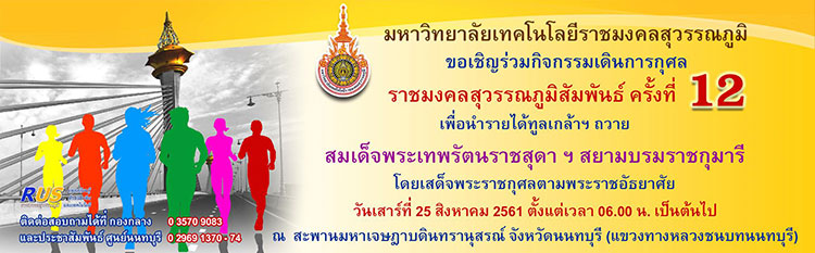 มหาวิทยาลัยเทคโนโลยีราชมงคลสุวรรณภูมิ ขอเชิญร่วมกิจกรรมเดินการกุศลราชมงคลสุวรรณภูมิ สัมพันธ์ ครั้งที่ ๑๒ เพื่อนำรายได้ทูลเกล้าฯ ถวาย สมเด็จพระเทพรัตนราชสุดา ฯ สยามบรมราชกุมารี โดยเสด็จพระราชกุศลตามพระราชอัธยาศัย ในวันเสาร์ที่ ๒๕ สิงหาคม ๒๕๖๑ ตั้งแต่เวลา ๐๖.๐๐ น.เป็นต้นไป ณ สะพานมหาเจษฎาบดินทรานุสรณ์ จังหวัดนนทบุรี (แขวงทางหลวงชนบทนนทบุรี) ติดต่อสอบถามได้ที่ กองกลาง ๐ ๓๕๗๐ ๙๐๘๓ หรือ งานประชาสัมพันธ์ ศูนย์นนทบุรี ๐ ๒๙๖๙ ๑๓๗๐ -๗๔