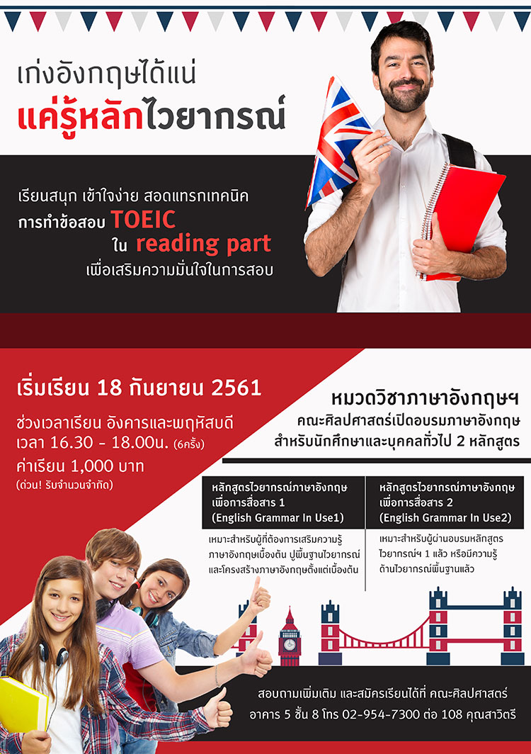 คณะศิลปศาสตร์ มหาวิทยาลัยธุรกิจบัณฑิตย์ ชวนผู้สนใจเข้าอบรมภาษาอังกฤษ “เก่งอังกฤษได้แน่ แค่รู้หลักไวยากรณ์” เรียนสนุก เข้าใจง่าย สอดแทรกเทคนิคการทำข้อสอบ TOEIC และ Reading Part เพื่อเสริมความมั่นใจในการสอบ โดยอบรมจำนวน 6 ครั้ง เริ่มคอร์สตั้งแต่วันที่ 18 กันยายน 2561 เรียนเฉพาะวันอังคารและวันพฤหัสบดี เวลา 16.30-18.00 น. ค่าเรียนเพียง 1,000 บาทเท่านั้น