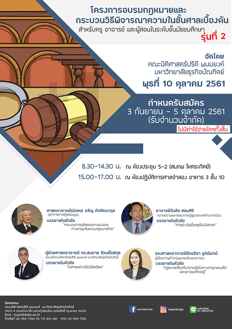 คณะนิติศาสตร์ปรีดีพนมยงค์ มหาวิทยาลัยธุรกิจบัณฑิตย์ ขอเชิญชวนผู้สนใจ ร่วมโครงการ อบรมกฎหมายและกระบวนวิธีพิจารณาในชั้นศาลเบื้องต้น สำหรับครูอาจารย์และผู้สอนในระดับชั้นมัธยมศึกษา รุ่นที่ 2 พบกับการบรรยายพิเศษ “กระบวนการยุติธรรมทางแพ่งและอาญาและระบบกฎหมายไทย” โดย ศาสตราจารย์ (พิเศษ) จรัญ ภักดีธนากุล ตุลาการศาลรัฐธรรมนูญ จากนั้นเป็นบรรยายด้วยหัวข้อที่น่าสนใจอีกมากมาย อาทิ ทำอย่างไรเมื่อครูต้องไปศาล, กฎหมายเกี่ยวกับความผิดในทางอาญาของเด็กและเยาวชนที่ควรรู้ และปิดท้ายด้วย การบรรยายและฝึกปฏิบัติเรื่อง ไปศาลอย่างไรไม่ให้เครียด โดยจัดขึ้นเพื่อส่งเสริมความรู้ความเข้าใจเรื่องกฎหมายให้กับครูอาจารย์และเพื่อเป็นประโยชน์ในการเรียนการสอนหรือแม้กระทั่งนำไปปรับใช้ในชีวิตประจำวัน ซึ่งจะจัดอบรมขึ้นใน วันพุธที่ 10 ตุลาคม 2561 ตั้งแต่เวลา 08.30 – 17.00 น. ณ ห้องประชุมสนมสุทธิพิทักษ์ อนุสรณ์ มหาวิทยาลัยธุรกิจบัณฑิตย์