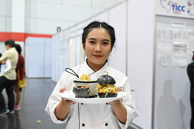 นายภานุพงษ์ โต่นวุธ ‘ดรีม’ น.ศ.ชั้นปี 2 ได้รางวัลเหรียญเงิน รายการ Seafood Free Style เล่าว่า ตนนำกุ้ง ปลาหมึก หอยเชลล์ ปู พร้อมด้วยปลากะพงมาเป็นวัตถุดิบหลัก และทำเป็นมูส และใช้อาหารทะเลดังกล่าวม้วนขึ้นรูป ประกอบกับผัดผักรวมสไตล์ฝรั่งเศส มีทั้งซอสครีมและซอสมะเขือเทศ และยังเลือกใช้ซูกินีนำมาโรลร่วมด้วย “การแข่งขันถ้าวางแผนและฝึกซ้อมอย่างดี จะทำให้เรามีโอกาสกว่าคนอื่น และต้องใช้กรรมวิธีการปรุงที่มากกว่าพื้นฐานทั่วไป ขณะที่รสชาติ และความสร้างสรรค์ภายใต้เวลาที่กำหนด ยังคงเป็นปัจจัยสำคัญ”