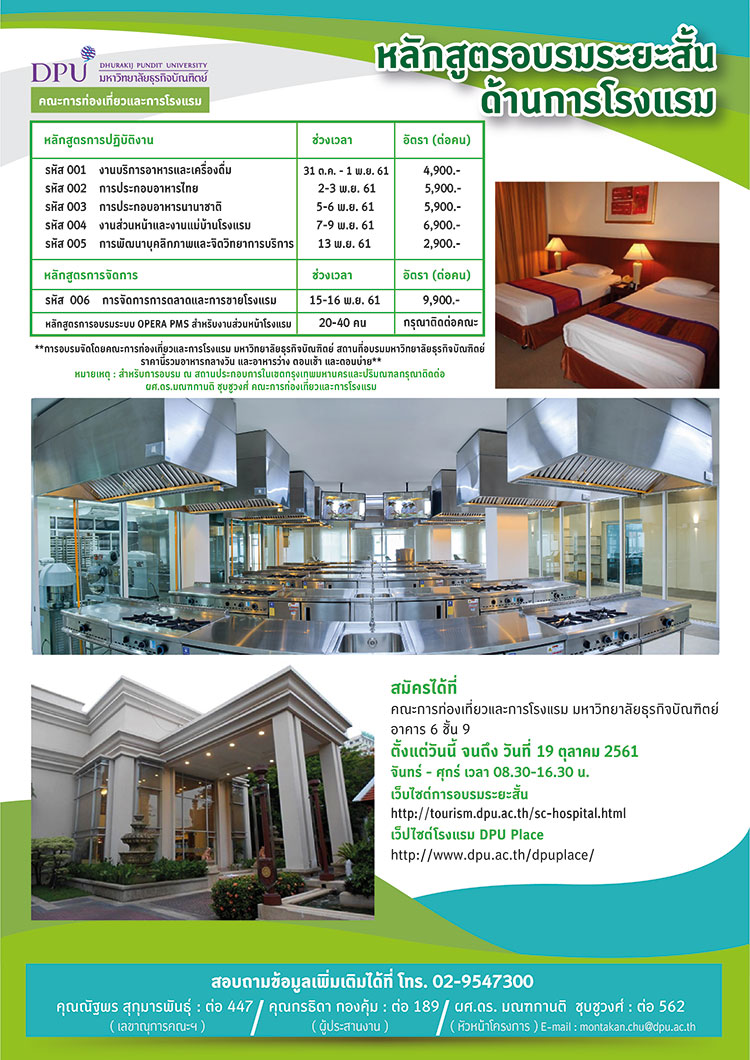 คณะการท่องเที่ยวและการโรงแรม มหาวิทยาลัยธุรกิจบัณฑิตย์ ขอเชิญชวนผู้สนใจเข้าอบรมระยะสั้นด้านการโรงแรม สำหรับผู้สนใจเปิดธุรกิจโรงแรม ธุรกิจที่พัก หรือผู้ที่กำลังทำงานอยู่ในโรงแรมและธุรกิจที่พัก มีให้เลือก 2 หลักสูตรคือ หลักสูตรการปฏิบัติงาน มีให้เลือกหลายหลักสูตร อาทิ การประกอบอาหารนานาชาติ งานส่วนหน้าโรงแรม การบัญชีโรงแรมเบื้องต้น การพัฒนาบุคลิกภาพและจิตวิทยาการบริการ งานแม่บ้านโรงแรม และงานบริการอาหารและเครื่องดื่ม โดยเปิดอบรมระหว่างวันที่ 31 ตุลาคม ถึง 13 พฤศจิกายน 2561