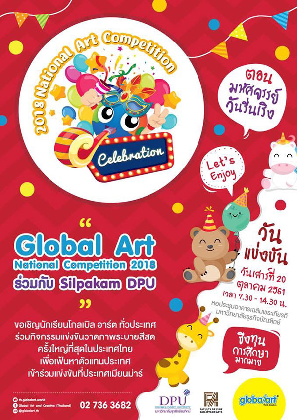 การแข่งขันระบายสีที่ใหญ่ที่สุดในประเทศไทยกำลังจะเริ่มขึ้น เมื่อคณะศิลปกรรมศาสตร์ มหาวิทยาลัยธุรกิจบัณฑิตย์ ร่วมกับ Global Art National Competition 2018 ชวนนักเรียนโกลเบิล อาร์ต ทั่วประเทศร่วมกิจกรรมแข่งขันวาดภาพระบายสีสด ตอน มหัศจรรย์วันรื่นเริง ชิงทุนการศึกษามากมาย เพื่อเฟ้นหาผู้ชนะได้เป็นตัวแทนประเทศไทยเข้าแข่งขันวาดภาพระบายสีที่ประเทศเมียนม่าร์