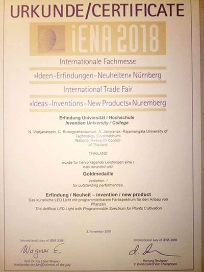 ผลงาน “The Artificial LED light with Programmable Spectrum for Plants Cultivation” โดย รศ.นภัทร วัจนเทพินทร์ ผศ.เฉลิมพล เรืองวัฒนาวิวัฒน์ และ นายอังสุชวาลนันท์ จำปานาค เป็นแหล่งกำเนิดแสงสำหรับการปลูกพืช แตกต่างจากหลอดไฟปลูกพืชในท้องตลาด คือ สามารถควบคุมพลังงานแสงและสเปกตรัมของแสงให้เหมาะสมกับพืชได้ ช่วยให้ประหยัดพลังงาน และใช้เป็นไฟเสริมให้กับพืชที่ปลูกในโรงเรือน สิ่งประดิษฐ์นี้ช่วยเพิ่มผลผลิตและลดระยะเวลาการเก็บเกี่ยวลง ช่วยให้ผลผลิตคุณภาพสูง ผลงานนี้ได้รับรางวัล “เหรียญทอง” พร้อมรางวัลพิเศษจากประเทศอิหร่าน อีก 1 รางวัล และยังได้รับเกียรติยศ “The Best Invention” จาก The 1st Inventor and Researcher in Iran