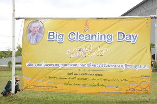 วันนี้ (23 พฤศจิกายน 2561) ณ อาคารเฉลิมพระเกียรติ ในโอกาสฉลองพระชนมายุ 5 รอบ 2 เมษายน 2558 มหาวิทยาลัยมหาสารคาม (เขตพื้นที่ในเมือง) กองอาคารสถานที่ มหาวิทยาลัยมหาสารคาม จัดโครงการ Big Cleaning Day ทำดีเพื่อพ่อ ถวายเป็นราชกุศลแด่พระบาทสมเด็จพระปรมินทรมหาภูมิพลอดุลยเดช ในหลวงรัชกาลที่ 9 อีกทั้งเป็นการเตรียมพื้นที่รับเสด็จ สมเด็จพระเทพรัตนราชสุดาฯ สยามบรมราชกุมารี จะเสด็จแทนสมเด็จพระเจ้าอยู่หัวมหาวชิราลงกรณ บดินทรเทพยวรางกูร พระราชทานปริญญาบัตรแก่ผู้สำเร็จการศึกษาจากมหาวิทยาลัยมหาสารคาม ประจำปีการศึกษา 2560 -2561 ในวันอังคารที่ 4 ธันวาคม 2561