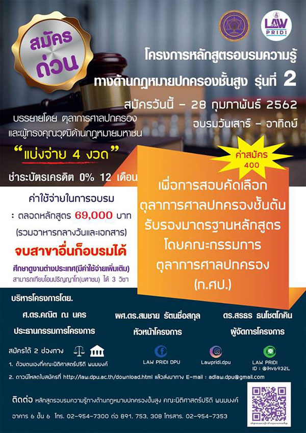เปิดรับสมัครตั้งแต่วันนี้ถึงวันที่ 28 กุมภาพันธ์ 2562 ณ คณะนิติศาสตร์ปรีดี พนมยงค์ มหาวิทยาลัยธุรกิจบัณฑิตย์ โดยจะมีการอบรมวันเสาร์-อาทิตย์ ผู้สนใจสามารถสำรองที่นั่งหรือติดต่อสอบถามรายละเอียดเพิ่มเติมได้ที่ คณะนิติศาสตร์ปรีดีพนมยงค์ โทร. 02-954-7300 ต่อ 891, 753, 308หรือ http://www.dpu.ac.th/law/