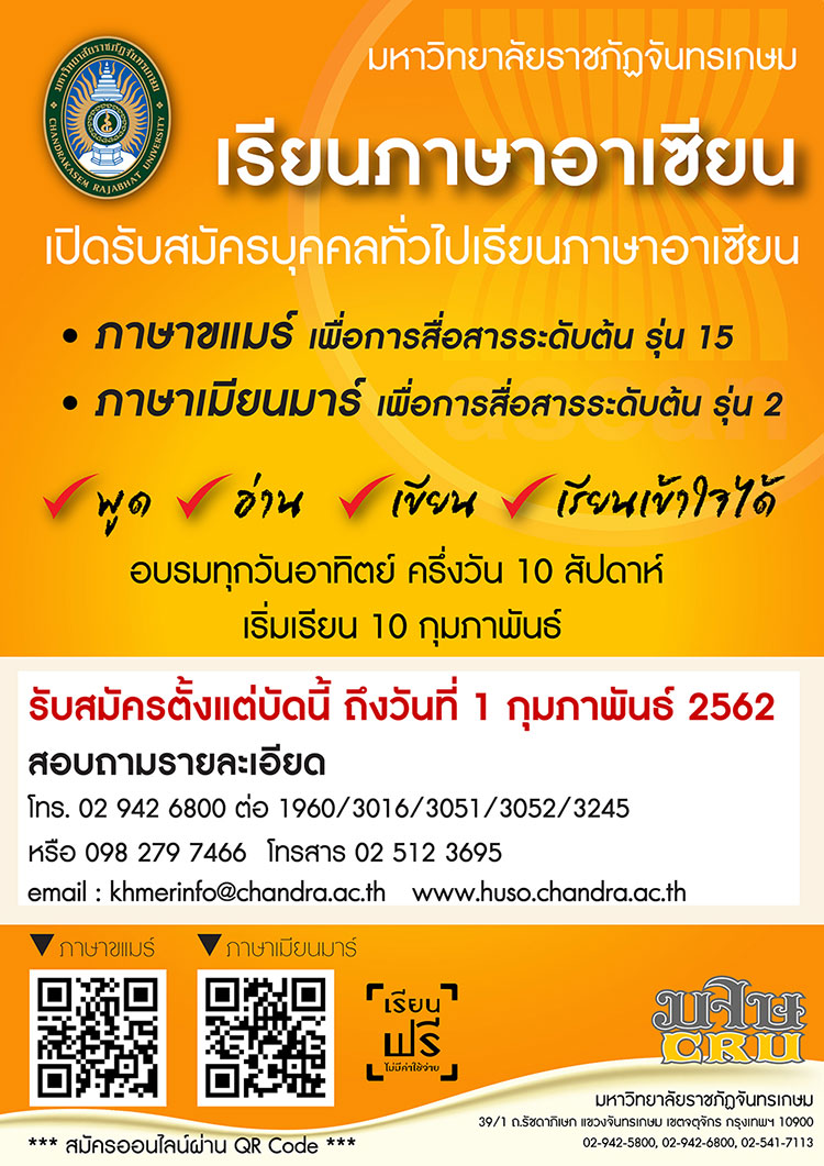 มหาวิทยาลัยราชภัฏจันทรเกษม (มจษ.) เปิดอบรมภาษาอาเซียน สำหรับบุคคลทั่วไปโดยไม่เสียค่าใช้จ่าย ในหลักสูตรภาษาขแมร์เพื่อการสื่อสารระดับต้น รุ่นที่ 15 และหลักสูตรภาษาเมียนมาร์ เพื่อการสื่อสารระดับต้น รุ่นที่ 2 อบรมทุกวันอาทิตย์ จำนวน 10 สัปดาห์ ผู้สนใจสมัครได้ตั้งแต่วันนี้ – 1 กุมภาพันธ์ 2562 สอบถามรายละเอียด โทร. 0 2942 6800 ต่อ 1960 3016 3051 3052 และ 3245 หรือ 09 8279 7466 หรือที่ www.huso.chandra.ac.th