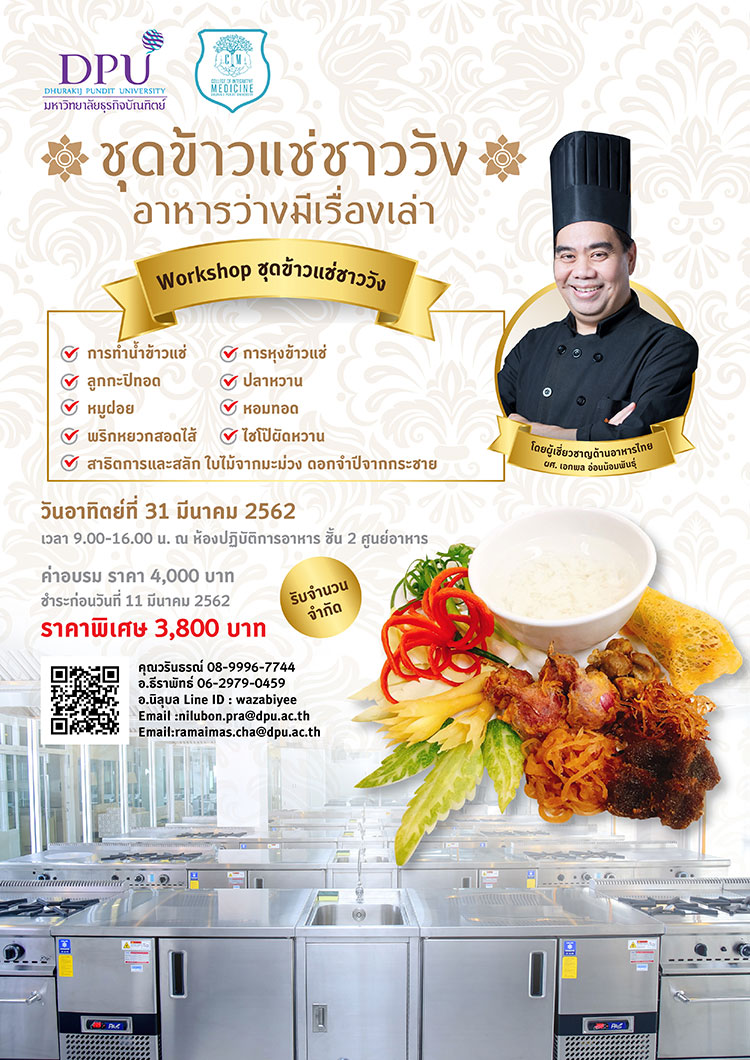 ซึ่งการอบรมการทำข้าวแช่ชาววังจะจัดขึ้นในวันอาทิตย์ที่ 31 มีนาคม 2562 เวลา 09.00-16.00 ที่ห้องปฎิบัติการอาหาร มหาวิทยาลัยธุรกิจบัณฑิตย์ ค่าอบรม 4,000 บาท ผู้สนใจสามารถสมัครเข้าอบรมได้ตั้งแต่บัดนี้ ด่วนรับจำนวนจำกัด สอบถามรายละเอียดโทร. 089-996-7744, 062-979-0459 หรือ Line id: wazabiyee