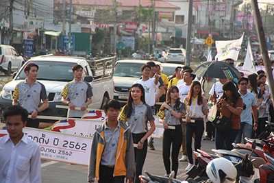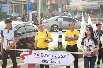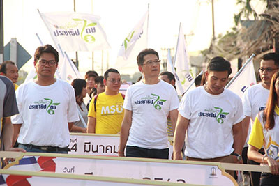 นอกจากนี้ รองอธิการบดี ผู้บริหาร บุคลากร นิสิตมหาวิทยาลัยมหาสารคาม และนักข่าว นักแสดง ช่อง3 อาทิ คุณกิตติ สิงหาปัด , กฤต เจนพานิชการ ร่วมเดินรณรงค์เชิญชวนการออกไปใช้สิทธิ์เลือกตั้งสภาผู้แทนราษฎร “จากมหาวิทยาลัยสู่ชุมชน” โดยเดินจากถนนหน้าอาคารบรมราชกุมารี มหาวิทยาลัยมหาสารคาม ไปจนถึง ตลาดคลองถม ตำบลท่าขอนยาง อำเภอกันทรวิชัย จังหวัดมหาสารคาม พร้อมแจกคู่มือการเลือกตั้ง และกล่าวเชิญชวนประชาชนให้ออกไปใช้สิทธิ์ใช้เสียงเลือกตั้งในครั้งนี้กันให้มากๆ