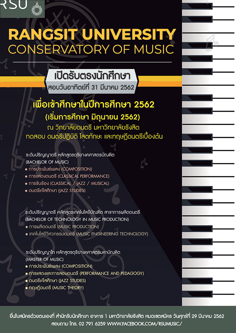 วิทยาลัยดนตรี มหาวิทยาลัยรังสิต เปิดรับสมัครผู้สนใจสอบเข้าศึกษาระดับปริญญาตรี และปริญญาโท ประจำปีการศึกษา 2562 โดยการสอบคัดเลือกตรง สำหรับผู้ที่ต้องการศึกษาต่อทางด้านดนตรีระดับปริญญาตรี หลักสูตรดุริยางคศาสตรบัณฑิต (สาขาการแสดงดนตรีคลาสสิคดนตรีแจ๊ส การขับร้อง การแสดงละครเพลง การประพันธ์เพลง) หลักสูตรเทคโนโลยีบัณฑิต (สาขาวิชาการผลิตดนตรี) และระดับปริญญาโท หลักสูตรหลักสูตรดุริยางคศาสตรมหาบัณฑิต กำหนดการสอบคัดเลือกในวันสอบวันอาทิตย์ที่ 31 มีนาคม 2562 ผู้สนใจสามารถยื่นใบสมัครได้ตั้งแต่บัดนี้ สอบถามรายละเอียดเพิ่มเติมได้ที่ สำนักงานแนะแนวและรับนักศึกษา มหาวิทยาลัยรังสิต โทร. 02 791 6259 หรือ เวปไซต์ www2.rsu.ac.th