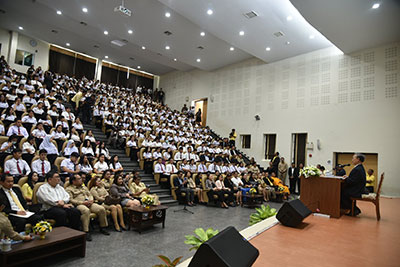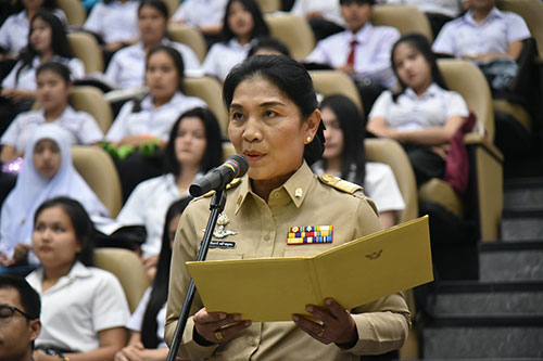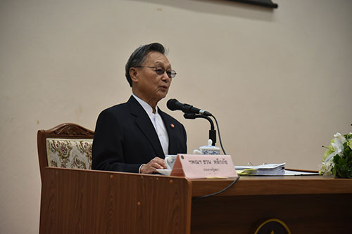 ด้าน ดร.พงษ์จันทร์ คล้ายอุดม รักษาราชการแทนอธิการบดีมหาวิทยาลัยราชภัฏสุราษฎร์ธานี กล่าวว่า ต่อจากนี้ไปจะเป็นช่วงเวลาที่มีค่าที่สุด นับจากวันนี้ทุกคนจะได้ใช้สรรพนามแทนตัวว่านักศึกษา ซึ่งมีความหมายว่า “ ผู้ที่ศึกษาหาความรู้ ทั้งในสาขาวิชาของตน และศาสตร์ความรู้ต่างๆ การที่จะเป็นนักศึกษาอย่างถึงพร้อมนั้นทุกคนต้องมีความมานะเพียรพยายามและตระหนักในบทบาทหน้าที่ของการเป็นนักศึกษาเพื่อรับใช้ชุมชนท้องถิ่นและประเทศชาติ ขอให้นักศึกษานิติศาสตร์ทุกคนมีความภาคภูมิใจที่ได้เป็นส่วนหนึ่งของมหาวิทยาลัยแห่งนี้ที่มุ่งผลิตและพัฒนานักศึกษาให้มีความเป็นเลิศทางด้าน วิชาการ ภาษา เทคโนโลยี คุณธรรมและจริยธรรม นักศึกษาต้องตระหนักถึงหน้าที่ของตนในการศึกษา เพื่อให้บรรลุถึงความสําเร็จคือ “บัณฑิต” อันจะเป็นกําลังหลักในการพัฒนาสังคมและประเทศชาติต่อไป