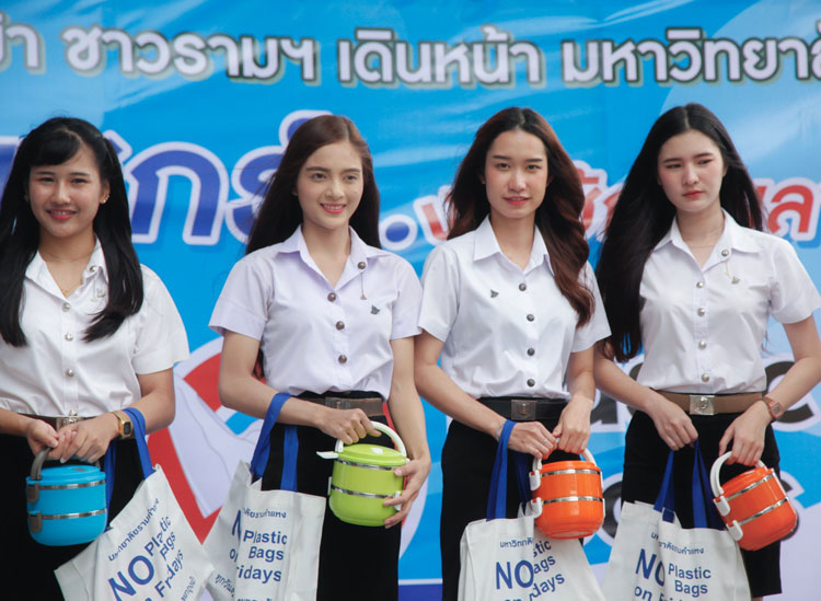 รามคำแหงเดินหน้าเป็นมหาวิทยาลัยสีเขียว ชวนผู้ประกอบการร้านค้า บุคลากร และนักศึกษางดใช้ถุงพลาสติกทุกวันศุกร์ภายในมหาวิทยาลัย หนุนใช้ถุงผ้าในชีวิตประจำวัน ช่วยลดปัญหามลพิษและช่วยกันรักษาสิ่งแวดล้อม