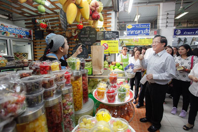 จากนั้น อธิการบดี ม.ร. นำคณะผู้บริหาร บุคลากร ผู้ประกอบการร้านค้า และนักศึกษา ติดสติกเกอร์รณรงค์งดใช้ถุงพลาสติก บริเวณโรงอาหารนพมาศ ชั้น 1 ด้วย
