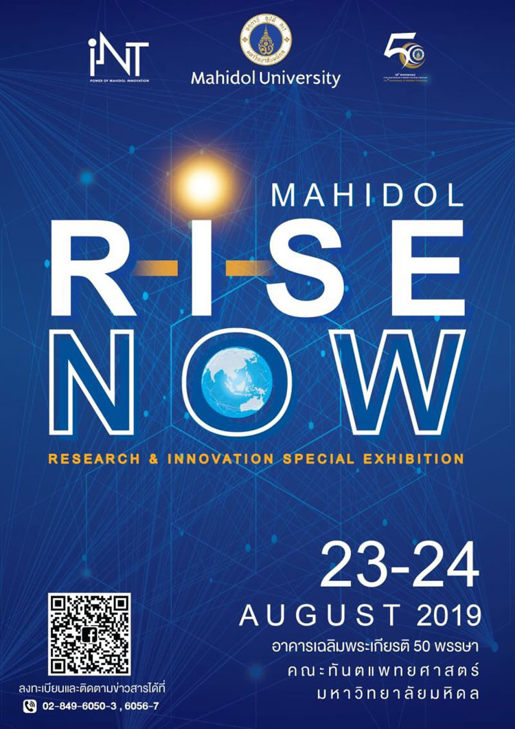 ผู้สนใจเข้าร่วมชมงานแสดงผลงานวิจัย และนวัตกรรมที่โดดเด่นของมหิดล ในงาน Mahidol University’s Research & Innovation Special Exhibition (Mahidol R-I-SE NOW) จะจัดขึ้นในวันศุกร์ที่ 23 ถึงวันเสาร์ที่ 24 สิงหาคม 2562 คณะทันตแพทยศาสตร์ มหาวิทยาลัยมหิดล ถนนโยธี สอบถามรายละเอียดเพิ่มเติมได้ ที่ โทร. 02 849 6050-3 หรือติดตามความเคลื่อนไหวได้ที่ www.facebook.com/MAHIDOLRISENOW