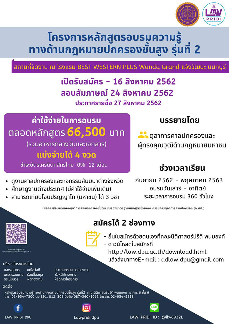 คณะนิติศาสตร์ปรีดี พนมยงค์ มหาวิทยาลัยธุรกิจบัณฑิตย์ ขอเชิญชวนผู้สนใจร่วมโครงการอบรมความรู้ทางด้านกฎหมายปกครองชั้นสูง รุ่นที่ 2 ด้วยหลักสูตรอบรมความรู้ทางด้านกฎหมายปกครองชั้นสูงของคณะนิติศาสตร์ปรีดี พนมยงค์ มหาวิทยาลัยธุรกิจบัณฑิตย์ ได้รับการรับรองโดยคณะกรรมการตุลาการศาลปกครอง (ก.ศป.) ในการสอบตุลาการศาลปกครอง เพื่อให้ผู้เข้าร่วมอบรมได้เรียนรู้และเข้าใจในแนวคิดและหลักการของกฎหมายมหาชนและกฎหมายปกครองทั้งในภาคทฤษฎีและภาคปฏิบัติ ทั้งยังสามารถนำหลักการแนวคิดเกี่ยวกับกฎหมายมหาชนและกฎหมายปกครองไปใช้ในการปฏิบัติงานทางด้านการอำนวยความยุติธรรมทางปกครอง รวมถึงเรียนรู้กระบวนวิธีพิจารณาคดีปกครองสามารถนำไปใช้ในการปฏิบัติงานจริงได้อย่างมีประสิทธิภาพ บรรยายโดยตุลาการศาลปกครองและผู้ครองคุณวุฒิด้านกฎหมายมหาชน นอกจากนี้ยังมีการดูงานที่ศาลปกครอง ดูงานที่ต่างประเทศและสามารถเทียบโอนปริญญาโท(มหาชน) ได้ 3 วิชา