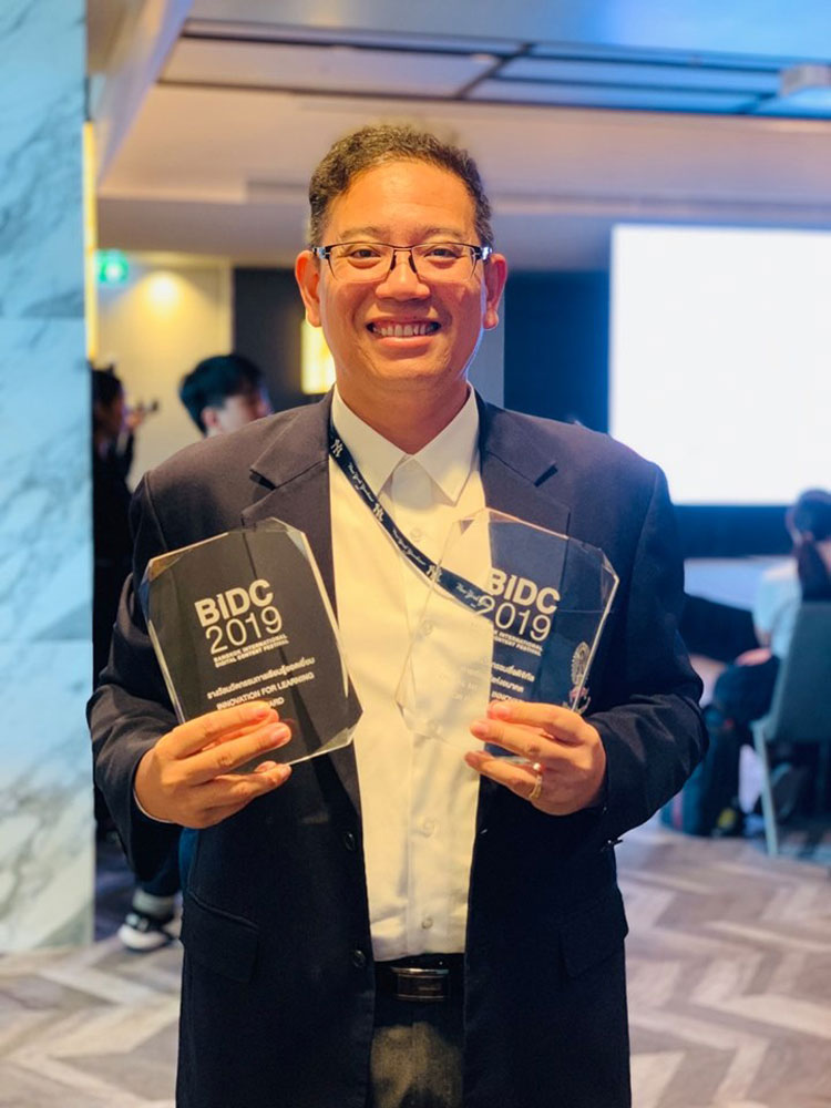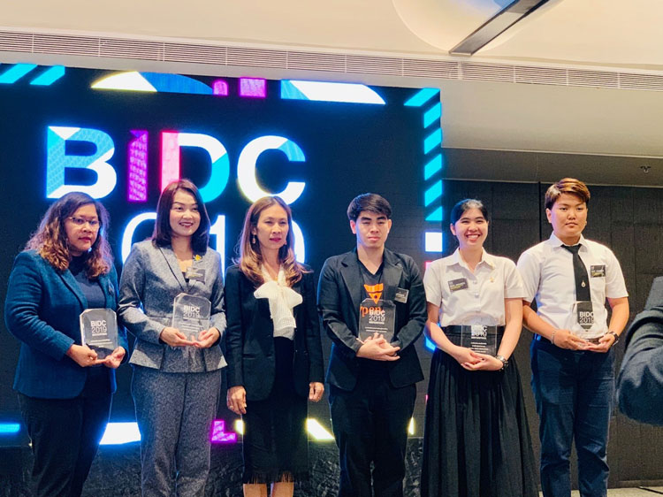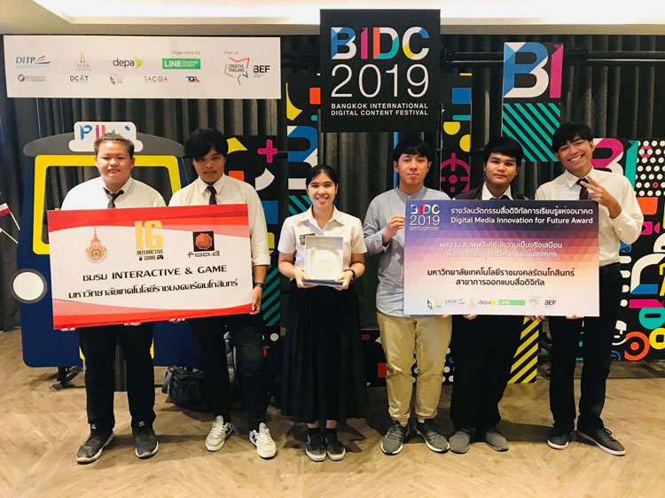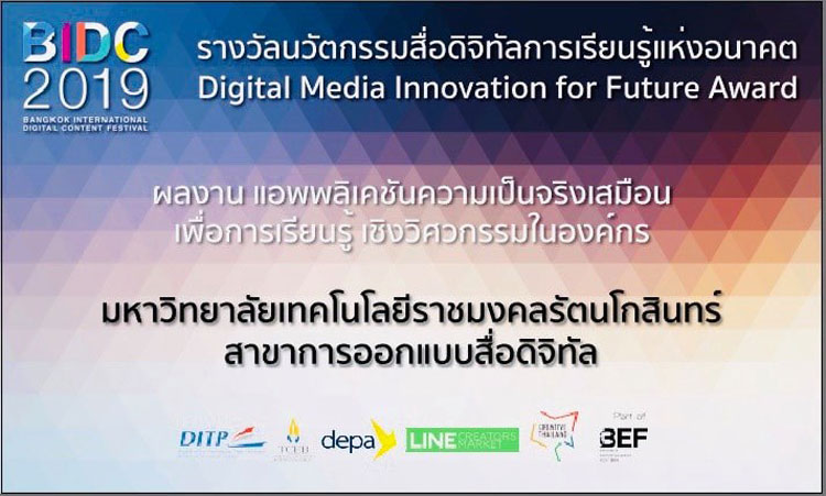 นางสาว พรทิพย์ แจ่มสระ สาขาการออกแบบสื่อดิจิทัล คณะสถาปัตยกรรมศาสตร์และการออกแบบ มหาวิทยาลัยเทคโนโลยีราชมงคลรัตนโกสินทร์(มทร.รัตนโกสินทร์ )คว้ารางวัลโล่เกียรติยศชนะเลิศ อันดับหนึ่ง ประเภทนานาชาติ จากการประกวดนวัตกรรมสื่อดิจิทัลการเรียนรู้แห่งอนาคต ด้วยผลงาน " แอพพลิเคชันความเป็นจริงเสมือนเพื่อการเรียนรู้เชิงวิศวกรรมในองค์กร " ในงาน Bangkok International Digital Content Festival 2019 (BIDC2019) โดยมีอาจารย์ ดร.ก้องเกียรติ หิรัญเกิด นำนักศึกษารับรางวัล จากรัฐมนตรีกระทรวงดิจิทัลเพื่อเศรษฐกิจและสังคม ณ โรงแรมบางกอกเมอร์เคียวควีนส์พาร์ค เมื่อวันที่ 16 สิงหาคม 2562 ที่ผ่านมา