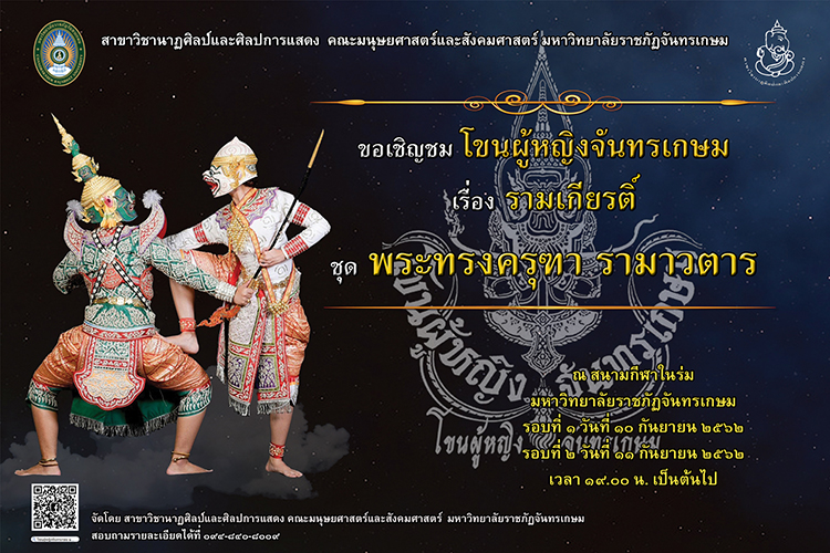 สาขาวิชานาฏศิลป์และศิลปการแสดง คณะมนุษยศาสตร์และสังคมศาสตร์ มหาวิทยาลัยราชภัฏจันทรเกษม (มจษ.) จัดการแสดงโขนผู้หญิงจันทรเกษม ในชุด “พระทรงครุฑา รามาวตาร” เพื่อเฉลิมพระเกียรติ พระบาทสมเด็จพระปรเมนทรรามาธิบดีศรีสินทรมหาวชิราลงกรณ พระวชิรเกล้าเจ้าอยู่หัว เนื่องในโอกาสปีมหามงคลพระราชพิธีบรมราชาภิเษก พร้อมร่วมฉลองวาระครบรอบ 79 ปี มหาวิทยาลัยราชภัฏจันทรเกษม เปิดการแสดง 10 – 11 กันยายนนี้