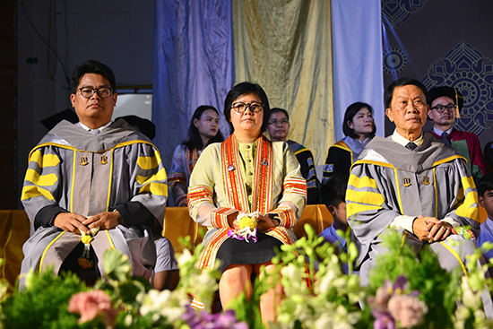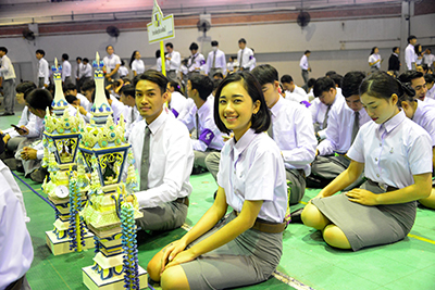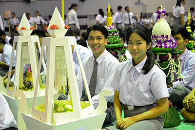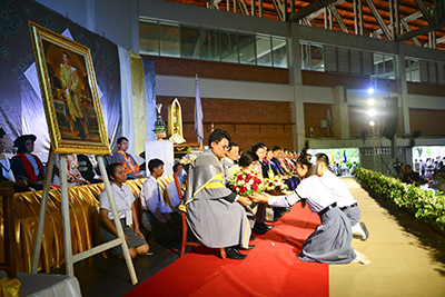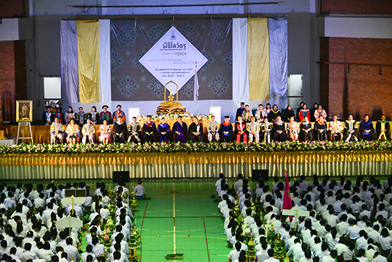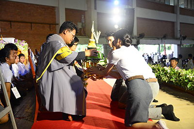 โอกาสนี้ ผู้รักษาราชการแทนอธิการบดีมหาวิทยาลัยมหาสารคาม ได้มอบเกียรติบัตรเชิดชูเกียรตินิสิตเรียนดี พร้อมมอบรางวัลผลการประกวดพานไหว้ครูประเภทสวยงาม และประเภทสร้างสรรค์ ก่อนที่จะกล่าวให้โอวาทแก่นิสิตในวันนี้ว่า “หลายคนมองว่า ชีวิต 4 ปี ในรั้วมหาวิทยาลัย เป็นระยะเวลาที่นาน แต่แท้ที่จริงแล้วมันเป็นระยะเวลาที่สั้นมาก ขอให้นิสิตที่รักทุกคน จงหมั่นศึกษาหาความรู้ และประสบการณ์ในการใช้ชีวิต ดูแลตนเองให้อยู่รอด ปลอดภัย แทนพ่อแม่ ผู้ปกครอง และญาติพี่น้องที่ฝากความหวังและอนาคตไว้กับเรา มหาวิทยาลัยเปรียบเสมือนแปลงสาธิตชีวิต ที่จะหล่อหลอมเราในทุก ๆ ด้าน ทั้งเรื่องวิชาความรู้ ทักษะการใช้ชีวิต การแก้ปัญหา และเอาตัวรอดในสังคม มหาวิทยาลัยมหาสารคาม เป็นสถาบันอุดมศึกษาที่ตั้งอยู่ใจกลางของชุมชน เรามีปรัชญามหาวิทยาลัยที่ว่า ผู้มีปัญญา พึงเป็นอยู่เพื่อสังคม เพราะมหาวิทยาลัยมุ่งหวังว่า ในวันที่เราสำเร็จการศึกษาออกไปเป็นบัณฑิต เราจะใช้ประสบการณ์และวิชาความรู้ ที่เก็บเกี่ยวและเรียนรู้ได้ไปใช้เพื่อพัฒนาชุมชน สังคมและประเทศชาติต่อไป”