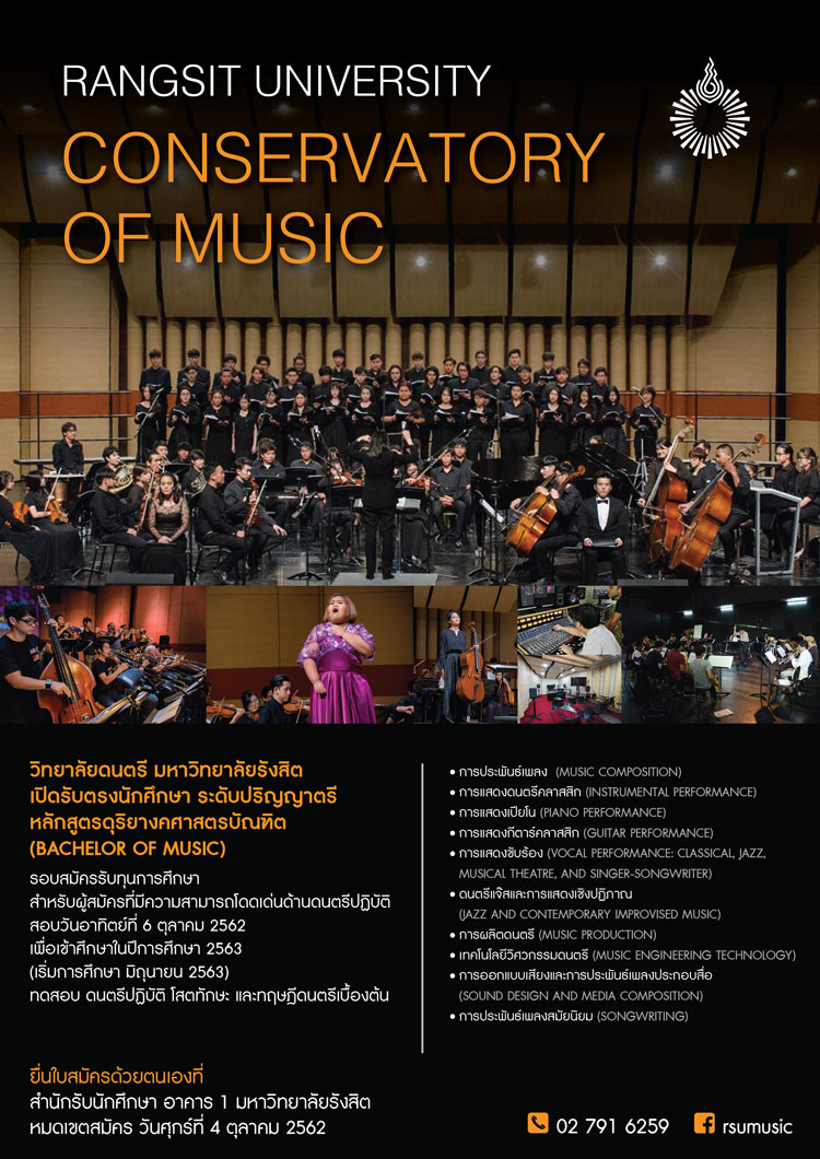 วิทยาลัยดนตรี มหาวิทยาลัยรังสิต เปิดรับสมัครผู้สนใจสอบเข้าศึกษาระดับปริญญาตรี และปริญญาโท ประจำปีการศึกษา 2562 โดยการสอบคัดเลือกตรง สำหรับผู้ที่ต้องการศึกษาต่อทางด้านดนตรีระดับปริญญาตรี หลักสูตรดุริยางคศาสตรบัณฑิต (สาขาการแสดงดนตรีคลาสสิคดนตรีแจ๊ส การขับร้อง การแสดงละครเพลง การประพันธ์เพลง) หลักสูตรเทคโนโลยีบัณฑิต (สาขาวิชาการผลิตดนตรี) และระดับปริญญาโท หลักสูตรหลักสูตรดุริยางคศาสตรมหาบัณฑิต กำหนดการสอบคัดเลือกในวันสอบวันอาทิตย์ที่ 6 ตุลาคม 2562 (เริ่มการศึกษาเดือนมิถุนายน 2563) ผู้สนใจสามารถยื่นใบสมัครได้ตั้งแต่บัดนี้ หมดเขตรับสมัครวันศุกร์ที่ 4 ตุลาคม 2562 สอบถามรายละเอียดเพิ่มเติมได้ที่ สำนักงานแนะแนวและรับนักศึกษา มหาวิทยาลัยรังสิต โทร. 02 791 6259 หรือ เวปไซต์ www2.rsu.ac.th