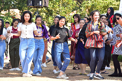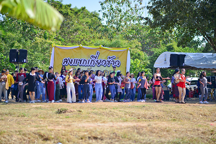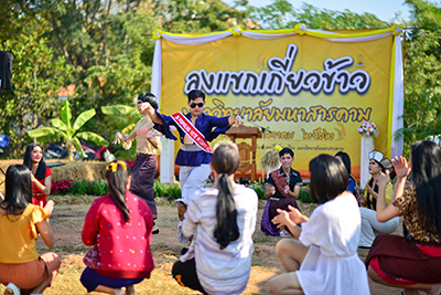 บรรยากาศก่อนลงแปลงนา มีสีสันที่เป็นเอกลักษณ์ของนิสิต มหาวิทยาลัยมหาสารคามไปแล้ว นั่นก็คือ นิสิตจากคณะศิลปกรรมศาสตร์ มหาวิทยาลัยมหาสารคาม แต่งกายชุดแฟนซี แปลกตา และสวยงาม จัดหนักจัดเต็ม พร้อมการแสดงออกลีลาประกอบเสียงเพลง เสียงดนตรี เพื่อสร้างสีสัน เรียกรอยยิ้ม และเสียงหัวเราะ เพิ่มบรรยากาศให้การลงแขกเกี่ยวข้าวเต็มไปด้วยความสนุกสนาน ก่อนที่จะร่วมกันลงแขกเกี่ยว บนเนื้อที่ 7 ไร่ เป็นข้าวขาวดอกมะลิ 105