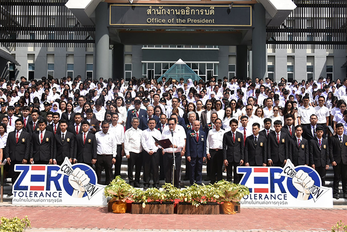 ผศ.ดร.วัฒนา รัตนพรหม รักษาราชการอธิการบดีมหาวิทยาลัยราชภัฏสุราษฎร์ธานี กล่าวว่า โครงการนี้จัดขึ้นเพื่อกระตุ้นให้ทุกภาคส่วนในสังคม ตระหนักถึงผลเสียหายร้ายแรงที่เกิดจากการทุจริตคอร์รัปชั่น และร่วมมือกันขับเคลื่อนการป้องกันและปราบปรามการทุจริต เพื่อลดปัญหาทุจริตคอร์รัปชั่นในจังหวัดสุราษฎร์ธานี โดยมหาวิทยาลัยราชภัฏสุราษฎร์ธานี ได้แสดงเจตนารมณ์ร่วมกับภาคีทุกภาคส่วน ที่มีความมุ่งมั่นในการแก้ไขปัญหาการทุจริต และปลุกกระแสสังคมไม่ทนต่อการทุจริต มุ่งยกระดับค่าดัชนีการรับรู้การทุจริตในองค์กร