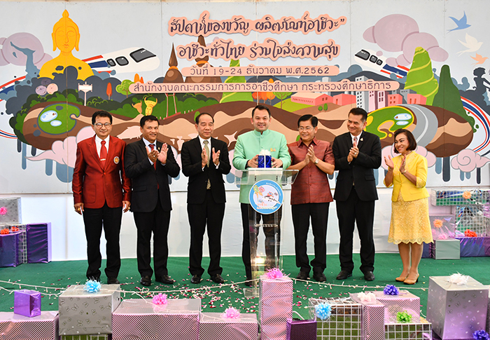 วันนี้ (19 ธันวาคม) นายณัฏฐพล ทีปสุวรรณ รัฐมนตรีว่าการกระทรวงศึกษาธิการ เป็นประธานเปิดสัปดาห์ของขวัญ ผลิตภัณฑ์อาชีวะ “อาชีวะทั่วไทย ร่วมใจส่งความสุข” ณ บริเวณด้านหน้าอาคารสำนักงานคณะกรรมการการอาชีวศึกษา ซึ่งมีกำหนดจัดขึ้นระหว่างวันที่ 19-24 ธันวาคม 2562 ในโอกาสนี้ รัฐมนตรีว่าการกระทรวงศึกษาธิการ ได้กล่าวขอบคุณสำนักงานคณะกรรมการการอาชีวศึกษา ที่มีความพยายามอย่างดียิ่ง ในการผลักดันขับเคลื่อนการจัดการอาชีวศึกษา และการปรับภาพลักษณ์อาชีวศึกษา ผ่านกิจกรรมที่เป็นประโยชน์ต่อสังคม ประเทศชาติ ตลอดจนเกิดประโยชน์ ต่อตัวนักเรียน นักศึกษา สอดคล้อง กับนโยบายและจุดเน้นของกระทรวงศึกษาธิการด้านอาชีวศึกษาที่มุ่งจัดการศึกษาอาชีวศึกษา เพื่อการมีงานทำ ก้าวสู่การเป็นผู้ประกอบการรุ่นใหม่ โดยเน้นให้ผู้เรียนมีทักษะทางวิชาชีพ และ ความเชี่ยวชาญ เฉพาะด้าน เป็นกำลังสำคัญในการขับเคลื่อนประเทศ และสามารถนำความรู้และทักษะไปประกอบอาชีพต่อไปในอนาคต