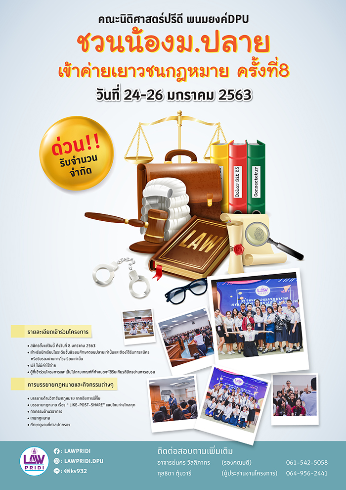 รับฟังแนะแนวศึกษาต่อและแนวทางการประกอบวิชาชีพนิติศาสตร์ จากอัยการตัวจริง อัยการทรงพล สุวรรณพงษ์ พี่ศิษย์เก่าคณะนิติศาสตร์ปรีดี พนมยงค์ พร้อมฟังบรรยายเรื่องกฎหมายที่น่าสนใจ ในหัวข้อ “Like-Post-Share” แบบไหนห่างไกลจากคุก โดย อ.ดร.อังค์วรา ไชยอนงค์ อาจารย์ประจำคณะนิติศาสตร์ปรีดี พนมยงค์ จัดขึ้นระหว่างวันที่ 24-26 มกราคม 2563 ณ มหาวิทยาลัยธุรกิจบัณฑิตย์