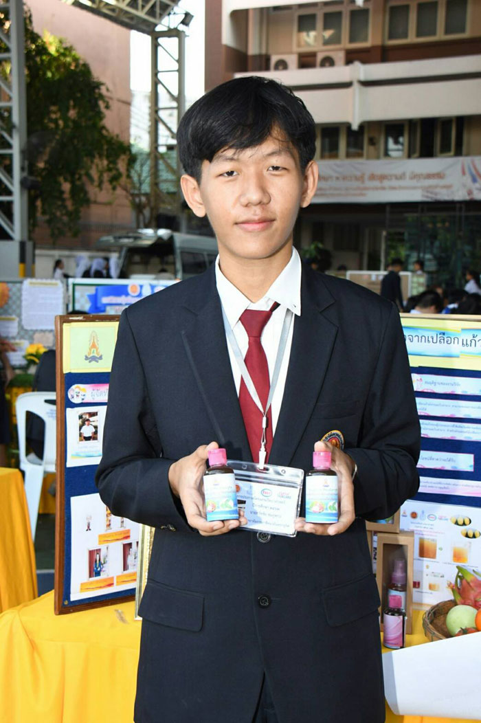 “น้องตี๋” นายธวัชชัย ชมพูพาน นักศึกษาชั้นปวช. 3 สาขาวิชาช่างอิเล็กทรอนิกส์ วิทยาลัยการอาชีพนวมินทราชูทิศ เล่าถึงสารเคลือบผิวผักและผลไม้สกัดจากเปลือกแก้วมังกรและใบย่านางว่า “การเคลือบผิวผลไม้” เป็นวิธีที่ช่วยลดอัตราการสูญเสียน้ำและยืดอายุการเก็บรักษาผักและผลไม้ภายหลังจากการเก็บเกี่ยว โดยผักและผลไม้ในปัจจุบัน เกษตรกรจะนิยมใช้สารสังเคราะห์ในการเคลือบผิวเพื่อให้มีอายุการเก็บรักษายาวนาน แต่มีอันตรายต่อสุขภาพ ตนและเพื่อนๆ จึงมีแนวคิดนำเปลือกแก้วมังกรและใบย่านางที่เหลือใช้มาสกัดจนได้สารเพกทิน หรือโพลีแซคคาไรด์ ซึ่งเป็นสารที่ช่วยยืดอายุผักและผลไม้ด้วยวิธีธรรมชาติ โดยขั้นตอนเริ่มจากนำเปลือกแก้วมังกรและใบย่านาง มาผึ่งแดดให้แห้ง เป็นเวลา 4 วัน หรืออบด้วยอุณหภูมิ 80 องศาเซลเซียส เป็นเวลา 8 ชั่วโมง ตัดสีเขียวของเปลือกแก้วมังกรออกให้หมด แล้วนำเปลือกแก้วมังกรสีชมพูและใบย่านางมาหั่นรวมกันเป็นชิ้น ขนาด 2x3 เซนติเมตร จนได้น้ำหนัก 1 กิโลกรัม จากนั้นนำไปปั่นแล้วใส่น้ำกลั่น 1 ลิตร คนให้ทั่ว ประมาณ 5 นาที จะเป็นเป็นสารสีแดงอมชมพู แล้วนำไปต้ม เป็นเวลา 1 ชั่วโมงครึ่ง จะเปลี่ยนเป็นสีขาวและสีเหลือง นำมากรองด้วยผ้าขาวบางและนำไปแกว่งตะกอนด้วยเอทานอลและอะซีโตน ทิ้งไว้ประมาณ 4 ชั่วโมง ผลิตภัณฑ์จะแยกชั้นจนได้เป็นสารเคลือบผิวสกัดจากเปลือกแก้วมังกรและใบย่างนาง โดยวิธีใช้นำสารเคลือบผิวฯ อัตราส่วน 1 ช้อนโต๊ะ ผสมกับน้ำ 1 ลิตร นำไปทาเคลือบผักและผลไม้เปลือกบาง ทั้งนี้ สารเคลือบผิวฯจะช่วยทดแทนชั้นไขธรรมชาติที่หลุดหายไปของผลไม้ในขั้นตอนการเก็บเกี่ยวหรือล้างทำความสะอาด ปิดช่องเปิดต่าง ๆ ตามธรรมชาติ ทำให้การสูญเสียน้ำและการแลกเปลี่ยนก๊าซลดน้อยลง สามารถคงคุณภาพของผลไม้เอาไว้ได้ นอกจากนี้ ยังช่วยให้เกิดความมันวาวกับผิวผลไม้ ทำให้ผลไม้มีความสวยงาม น่ารับประทาน หากสนใจสั่งซื้อสารเคลือบผิวผักผลไม้สกัดจากเปลือกแก้วมังกรและใบย่านาง มี 2 แบบ คือแบบขวด ขนาด 50 มิลลิลิตร หรือแบบสเปรย์ฉีดพ่น ขนาด 80 มิลลิลิตร ขายในราคา 50 บาท ติดต่อได้ที่โทร.087-989-1956 หรือที่วิทยาลัยการอาชีพนวมินทราชูทิศ