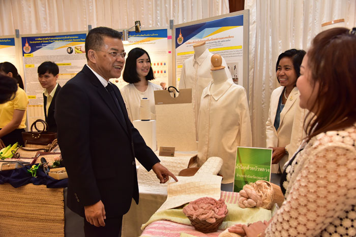ทางด้านผู้ช่วยศาสตราจารย์ ดร.สาคร ชลสาคร คณบดีคณะเทคโนโลยีคหกรรมศาสตร์ หัวหน้างานวิจัยการพัฒนาเส้นใยกล้วย กล่าวเพิ่มเติมว่า จากการนำกาบกล้วยมาปั่นเป็นเส้นด้าย ซึ่งเส้นใยกล้วย มีคุณสมบัติเด่นในด้านความแข็งแรง และเงามันสามารถขึ้นรูปเป็นเส้นด้าย ยังสามารถนำมาต่อยอดทอเป็นผืนผ้าและผลิตเป็นผลิตภัณฑ์เครื่องแต่งกายและเคหะสิ่งทอ ถือเป็นการลดวัสดุเหลือใช้จากกระบวนการผลิตกล้วย และสร้างมูลค่าด้านการพัฒนาเส้นใยในอุตสาหกรรมสิ่งทอให้แก่เกษตรกร ลดการนำเส้นใยธรรมชาติ จากต่างประเทศ อีกทั้งยังช่วยเพิ่มทางเลือกใช้ผ้าจากเส้นใยกล้วย ซึ่งเป็นแนวโน้มในการผลิตเสื้อผ้า Eco-friendly เป็นมิตรต่อสิ่งแวดล้อม นำงานวิจัยมาถ่ายทอดและต่อยอดให้เกษตรกรเพื่อสร้างรายได้ และสร้างความเป็นอัตลักษณ์ผ้าจากเส้นใยกล้วยของจังหวัดปทุมธานี