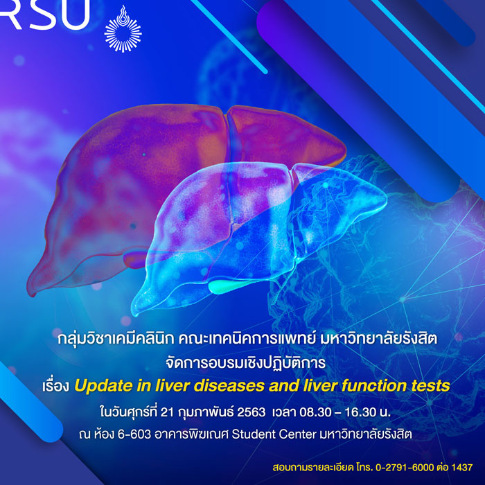 คณะเทคนิคการแพทย์ มหาวิทยาลัยรังสิต จัดการอบรมเชิงปฏิบัติการ เรื่อง Update in liver diseases and liver function tests ในวันศุกร์ที่ 21 กุมภาพันธ์ 2563 เวลา 08.30 - 16.30 น. ณ ห้อง 6-603 อาคารพิฆเณศ Student Center มหาวิทยาลัยรังสิต เพื่อให้ผู้เข้าร่วมประชุมมีความรู้ความเข้าใจเกี่ยวกับโรคตับ การตรวจการทำงานของตับและแนวทางในการวินิจฉัยโรคตับของแพทย์ที่เป็นปัจจุบัน