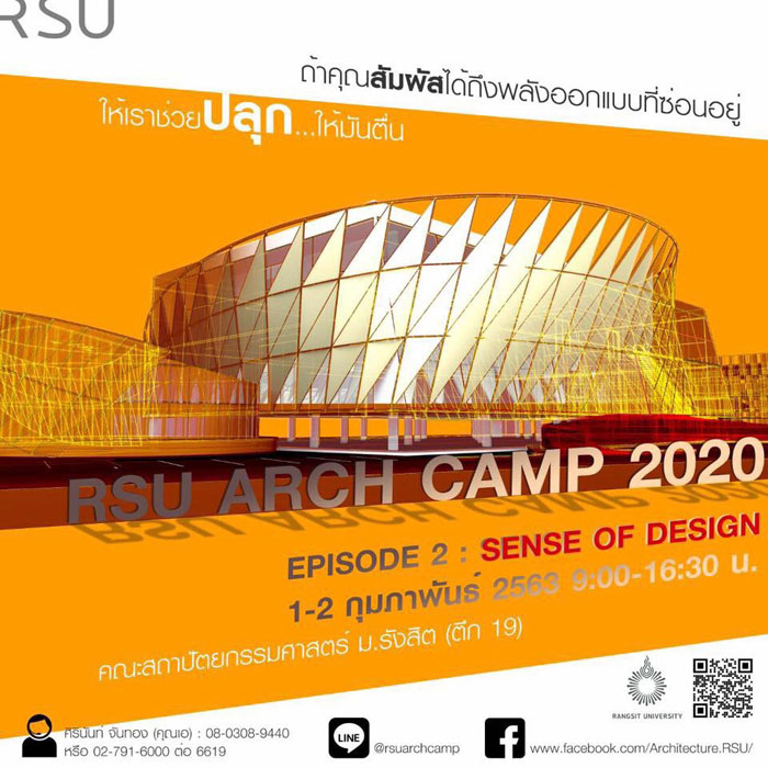 คณะสถาปัตยกรรมศาสตร์ มหาวิทยาลัยรังสิต ขอเชิญชวนเด็ก ม.ปลายทุกระดับชั้น ปวช. และ ปวส. มาทดลองเรียนรู้ค้นหาความเป็นนักครีเอทีฟ ชอบงานดีไซน์ งานออกแบบด้านสถาปัตยกรรมศาสตร์ กับแคมป์เด็กถาปัตย์ ปลุกพลังนักออกแบบในตัวคุณ “RSUARCH CAMP 2020 (Episode 2 : Sense of Design” ระหว่างวันที่ 1-2 กุมภาพันธ์ 2563 เวลา 9.00-16.30 น. ณ อาคารสถาปัตยกรรมศาสตร์ (อาคาร 19) มหาวิทยาลัยรังสิต เข้าร่วมครบตามหลักสูตรรับประกาศนียบัตรใช้เป็นส่วนหนึ่งของ Portfolio เพื่อการสมัครเรียนต่อในสาขาวิชาที่เกี่ยวข้องได้ สำหรับผู้สนใจเข้าร่วมแคมป์สามารถกรอกใบสมัครออนไลน์ได้ที่[http://%20www.rsu.ac.th%20หรือโทร.%20] www.rsu.ac.th หรือโทร. 02 791 6000 ต่อ 6619