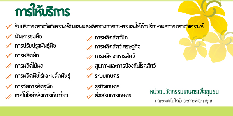- รับบริการตรวจวัดวิเคราะห์ดินและผลผลิตทางการเกษตรและให้คำปรึกษาผลการตรวจวิเคราะห์