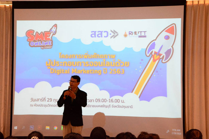 เมื่อเวลา 10.00 น. วันที่ 29 ก.พ. 2563 สำนักงานส่งเสริมวิสาหกิจขนาดกลางและขนาดย่อม (สสว.) ร่วมกับ มหาวิทยาลัยเทคโนโลยีราชมงคลธัญบุรี (มทร.ธัญบุรี) ได้จัดงานสัมมนาโครงการเพิ่มศักยภาพผู้ประกอบการออนไลน์ด้วย Digital Marketing ปีงบประมาณ 2563 ในหัวข้อ การตลาดในยุคดิจิทัล ที่ ห้องประชุมวิกตอเรีย ชั้น 1 อาคารสำนักงานอธิการบดี มหาวิทยาลัยเทคโนโลยีราชมงคลธัญบุรี โดยมี ดร.วิเชษฐ์ พลายมาศ หัวหน้ากลุ่มงานบริการสารสนเทศ สำนักวิทยบริการและเทคโนโลยีสารสนเทศ มหาวิทยาลัยเทคโนโลยีราชมงคลธัญบุรี เป็นประธานเปิดงาน มีผู้ประกอบการ SME และผู้ที่สนใจอยากเป็นผู้ประกอบการรุ่นใหม่ เข้าร่วมกว่า 200 ราย