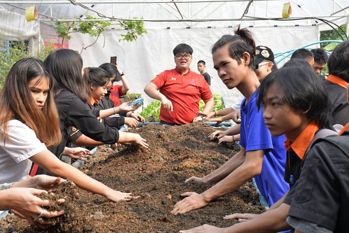 คณะวิทยาศาสตร์และเทคโนโลยี จัดโครงการพัฒนาการปลูกผักออร์แกนิกส์ด้วยสารสกัดชีวภาพร่วมกับกลไกการกระตุ้นชีวหัวเชื้อจุลินทรีย์นาโนผสมกับปุ๋ยชีวภาพนาโน (bio stimulation) ชุมชนบึงบา อำเภอหนองเสือ จังหวัดปทุมธานี โดยมี ผู้ช่วยศาสตราจารย์ ดร.สุกาญจน์ รัตนเลิศนุสรณ์ อาจารย์สาขาวิชาชีววิทยาเป็นวิทยากรถ่ายทอดความรู้และเทคนิคในการปลูกผักอินทรีย์ด้วยปุ๋ยชีวภาพและสารสกัดชีวภาพร่วมกับจุลินทรีย์นาโน (สูตรปรับปรุงใหม่) เพื่อความสะดวกแก่เกษตรกร เพิ่มผลผลิต ลดต้นทุน ผลผลิตได้มาตรฐาน EU พร้อมกันนี้ นักศึกษาได้บูรณาการองค์ความรู้ในการเรียนการสอนรายวิชาชีวิตกับสิ่งแวดล้อม โดยนักศึกษานำองค์ความรู้และปฏิบัติการจริงเพื่อแก้ปัญหามลพิษดินกรดด้วยกลไกการตุ้นและลดมลสารอันตรายปนเปื้อน ร่วมกับหัวเชื้อจุลินทรีย์ นาโน THAN สำหรับการเกษตรอินทรีย์ ณ สวนเราเกษตรอินทรีย์ ตำบลบึงบา อำเภอหนองเสือ จังหวัดปทุมธานี